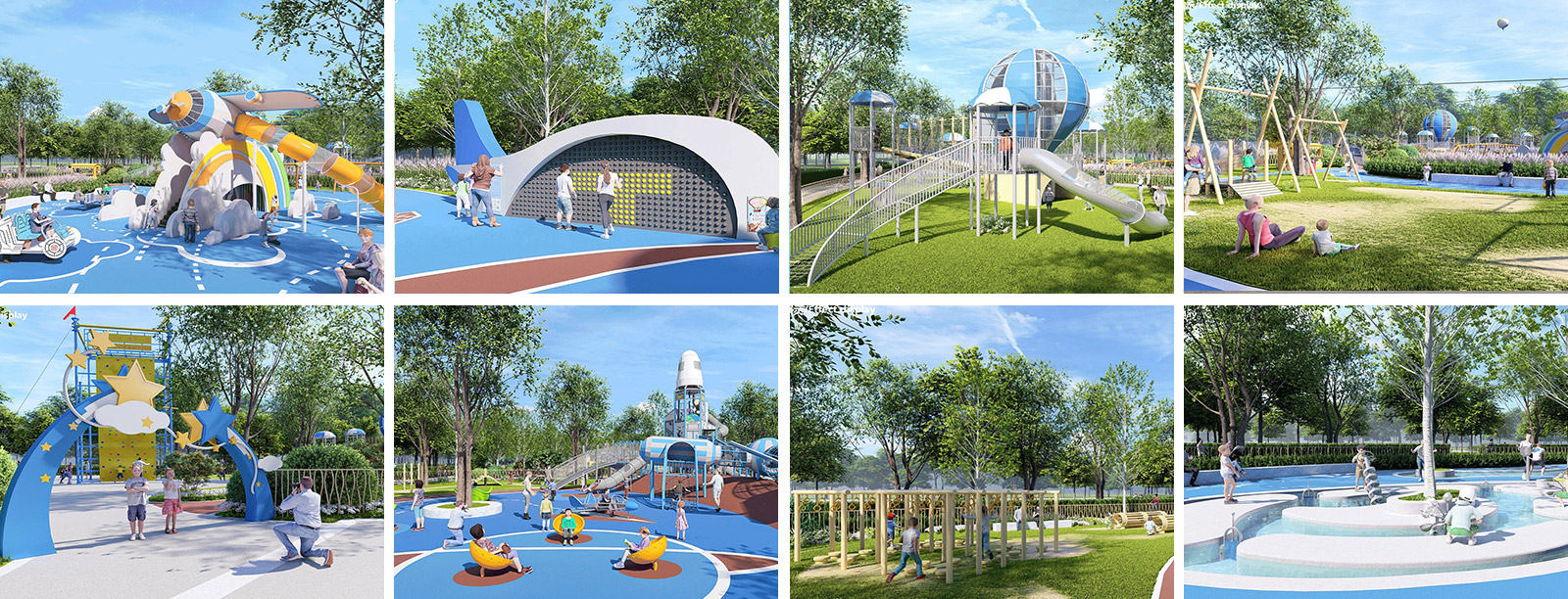 The playground of the General Aviation Theme Park has five functional areas: rocket area, dream chasing area, dream sailing area, and flight unlocking area, which respectively represent different stages in the process of Xiaohang's dream pursuit.The rocket zone is equipped with many different types of outdoor playground equipment and the outdoor playground equipment is according to the theme of this functional area to make an appearance design, so that it can conform to the story scene and development of the storyline.Meanwhile, the rocket zone has the following outdoor amusement equipment, for example, the rocket tower playground, space station playground,micro-terrain rock climbing point,micro-terrain climbing rope,plane-shape rocking horse, creative wall, inclusive play equipment, and spinning top play equipment.